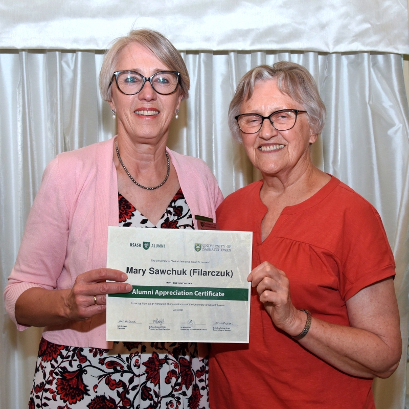 Mary Sawchuk and Solina Richter smiling for a photo in front of an ivory curtain, holding an Alumni Appreciation Certificate