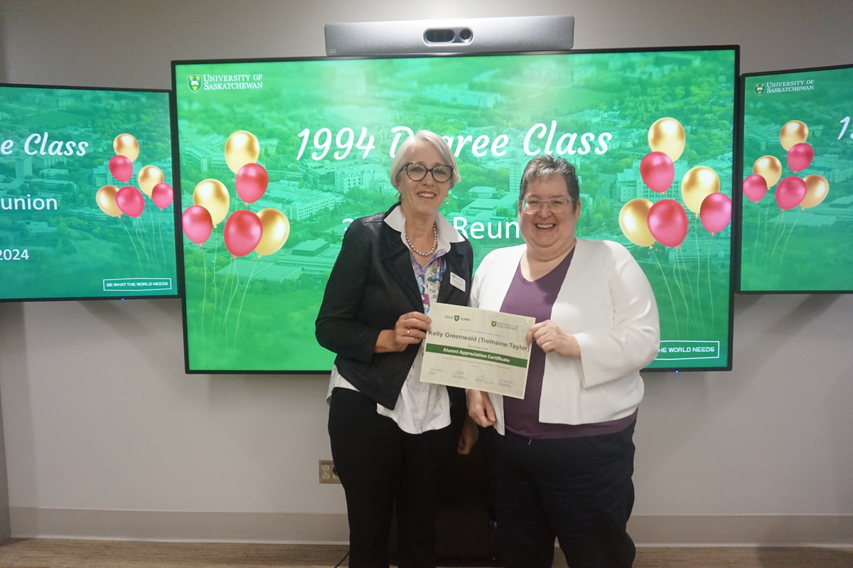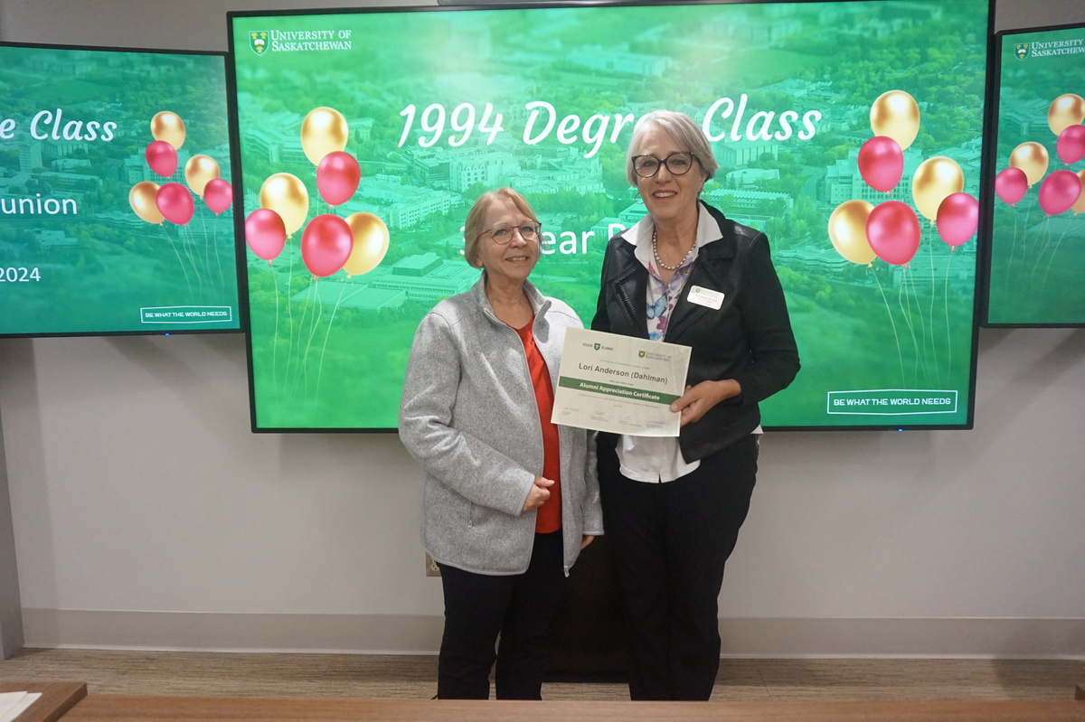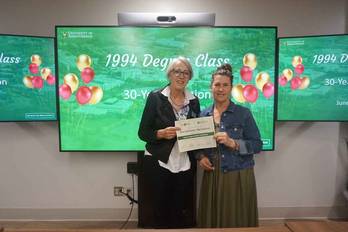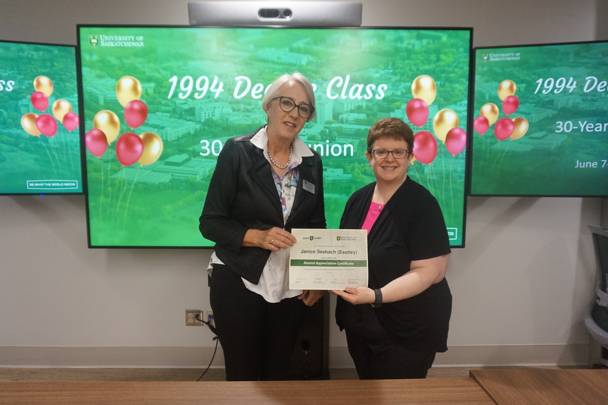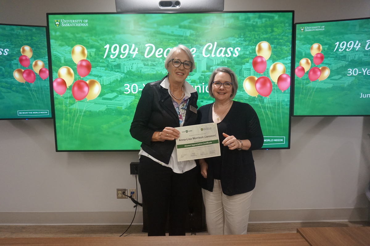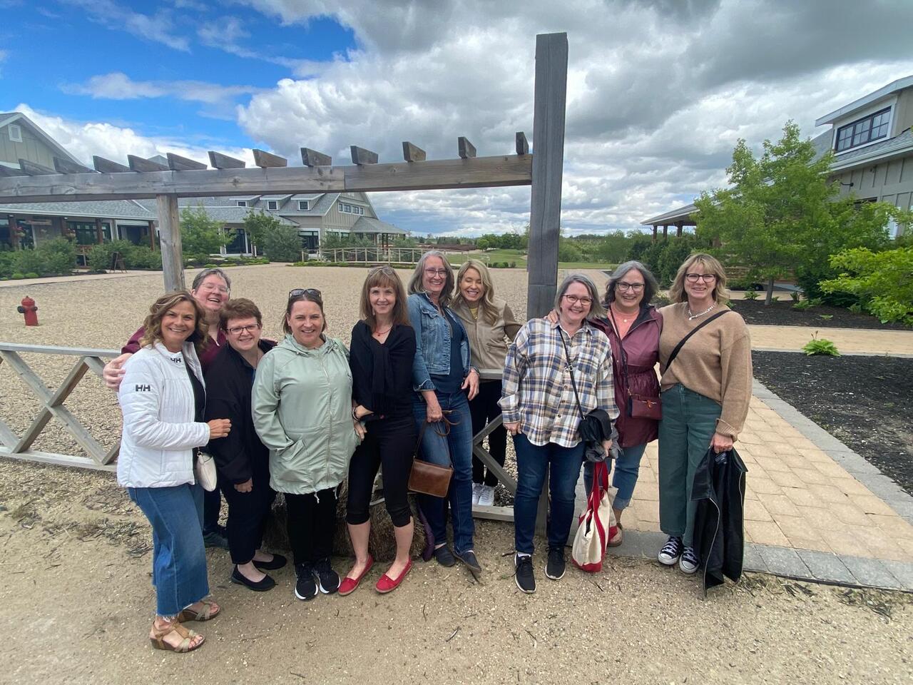 Group photo of the women who attended the 1994 degree class reunion. 3 women sitting on chairs and 8 are standing behind them in front of a wall of plants in the Health Sciences building.