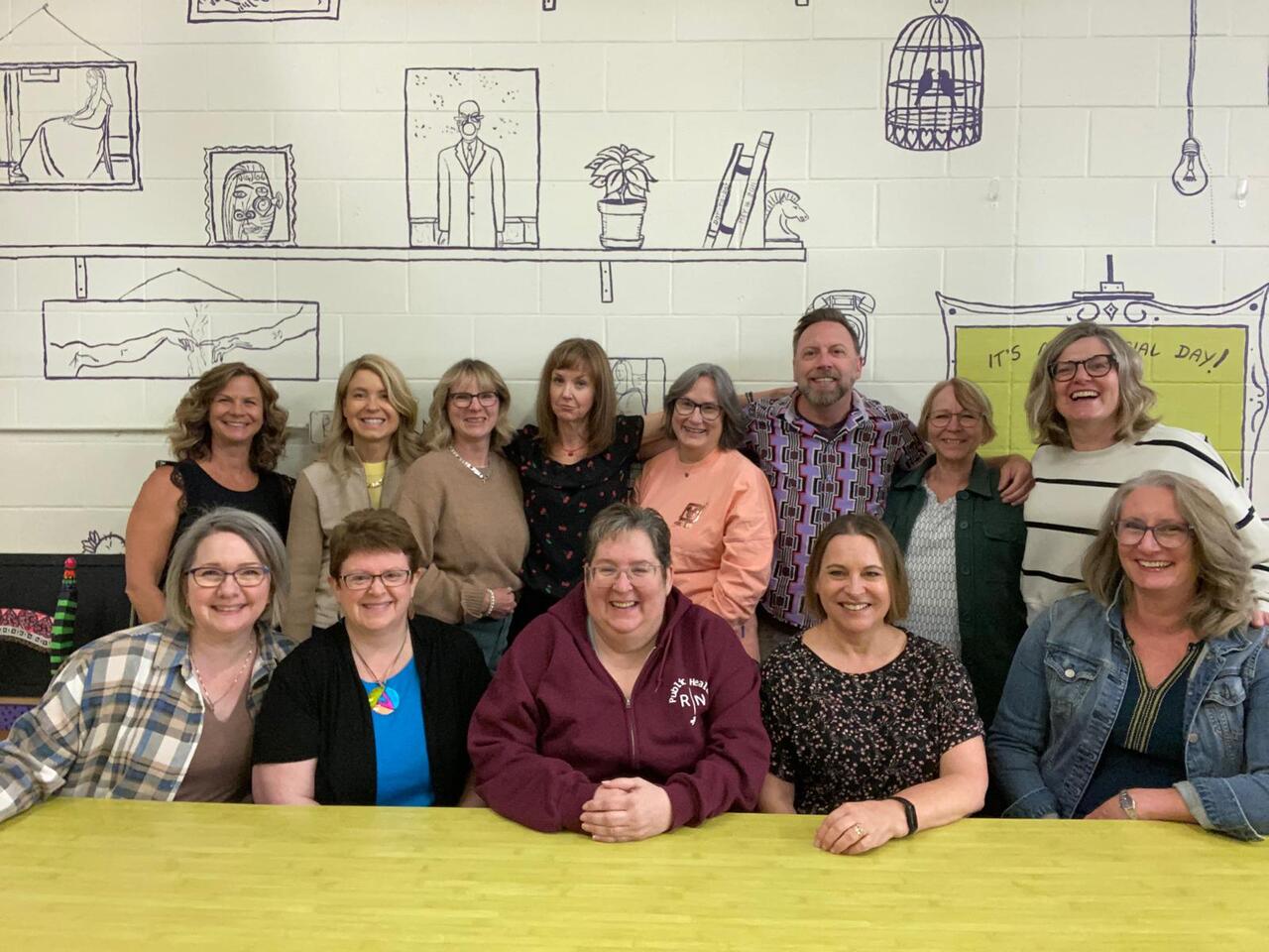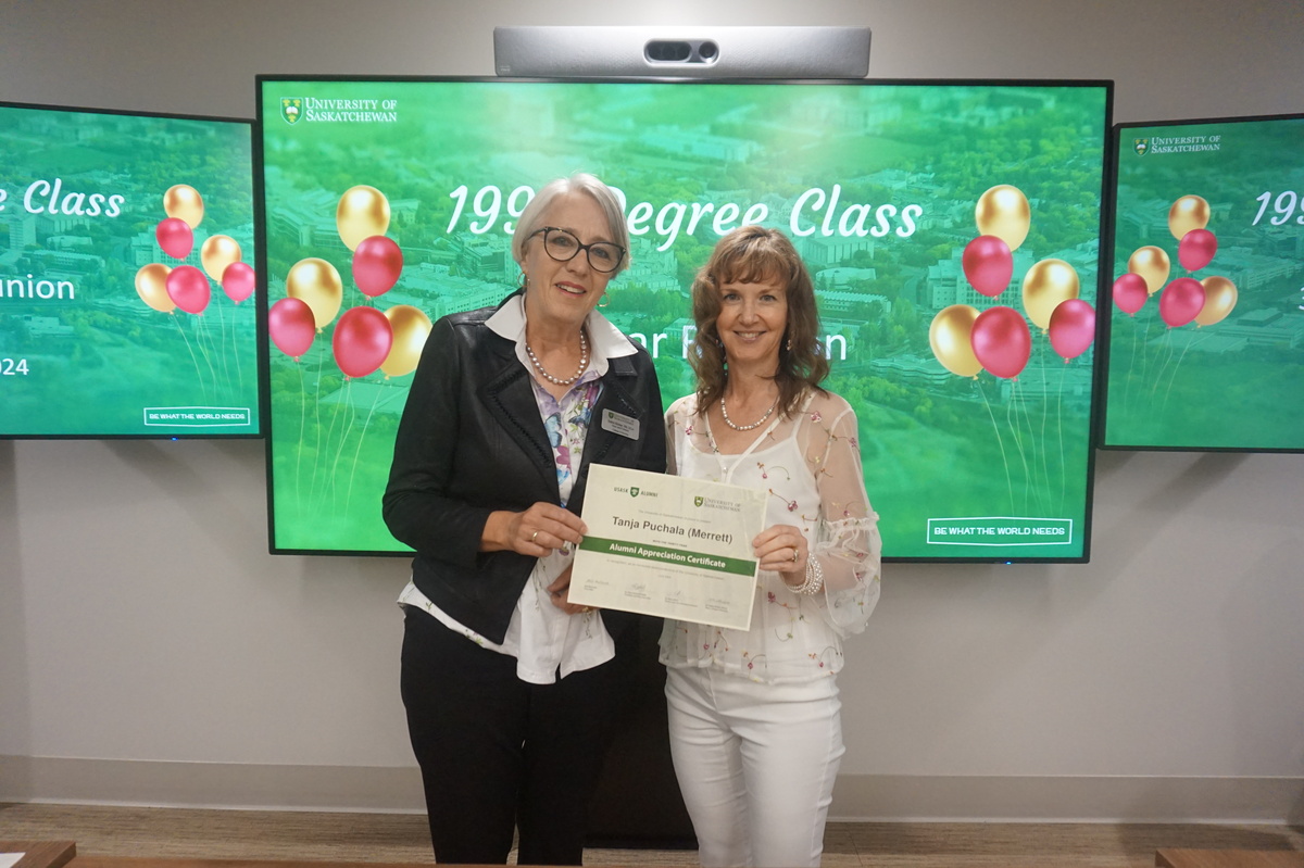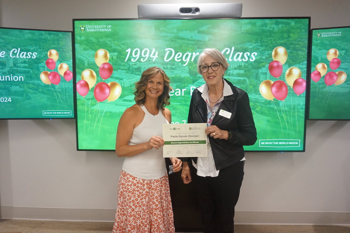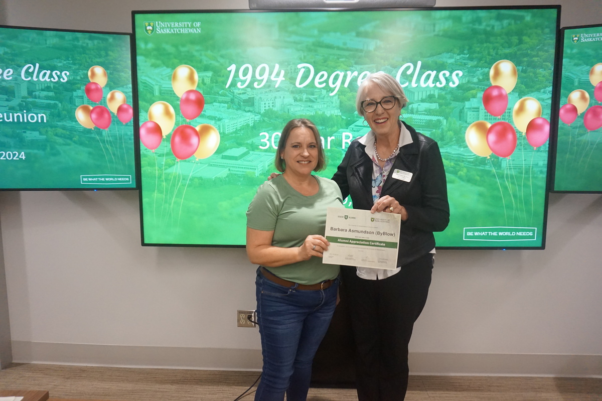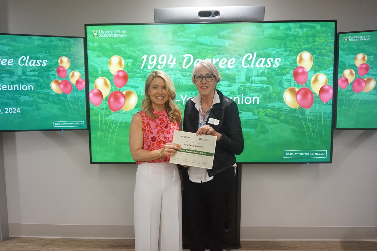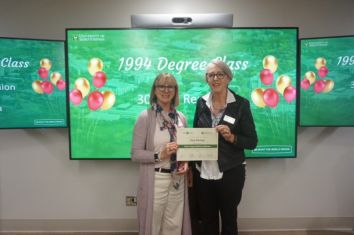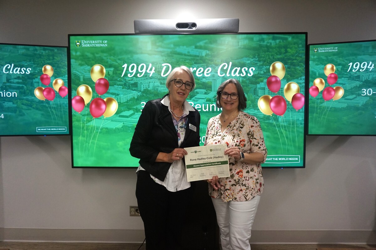 Group photo of the women who attended the 1994 degree class reunion. 3 women sitting on chairs and 8 are standing behind them in front of a wall of plants in the Health Sciences building.