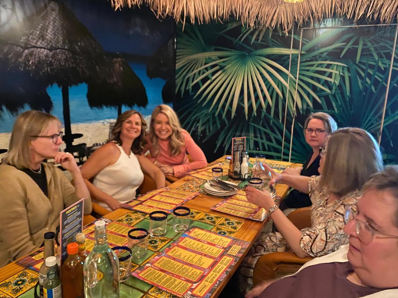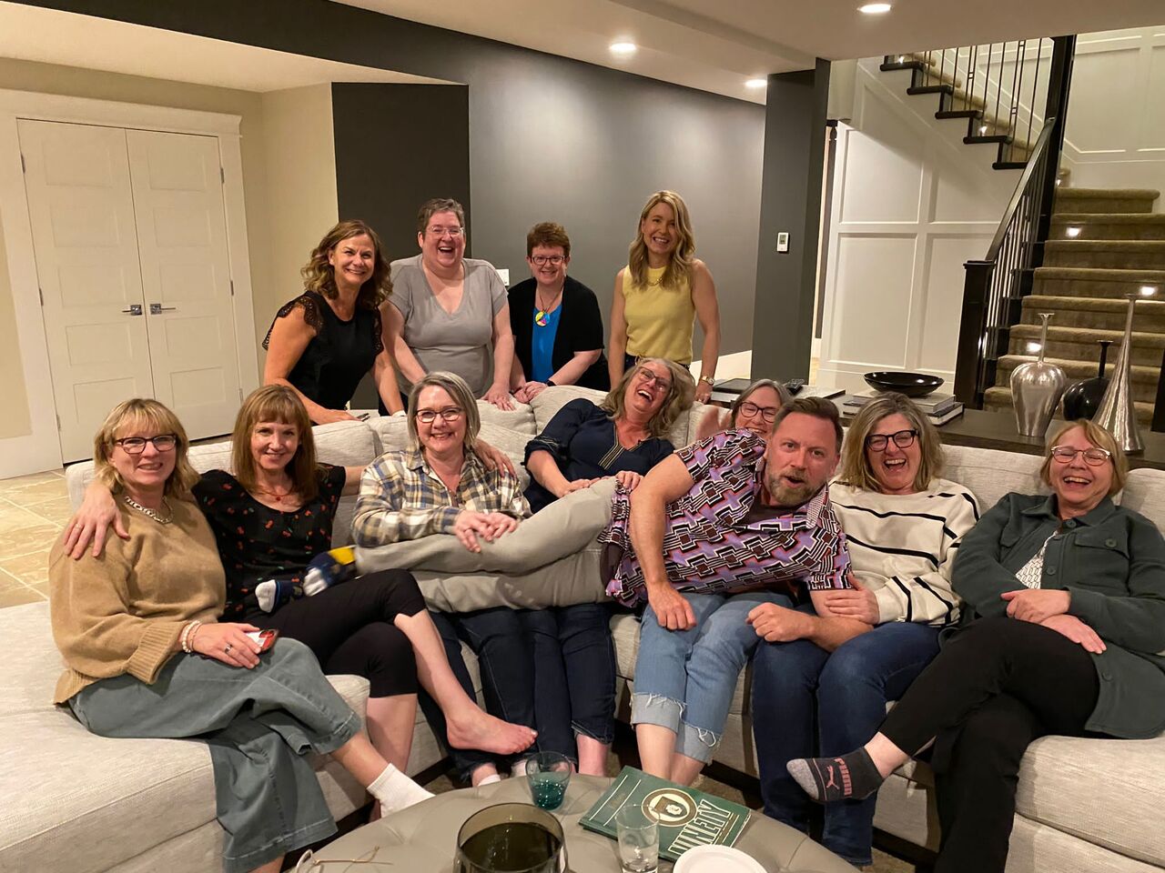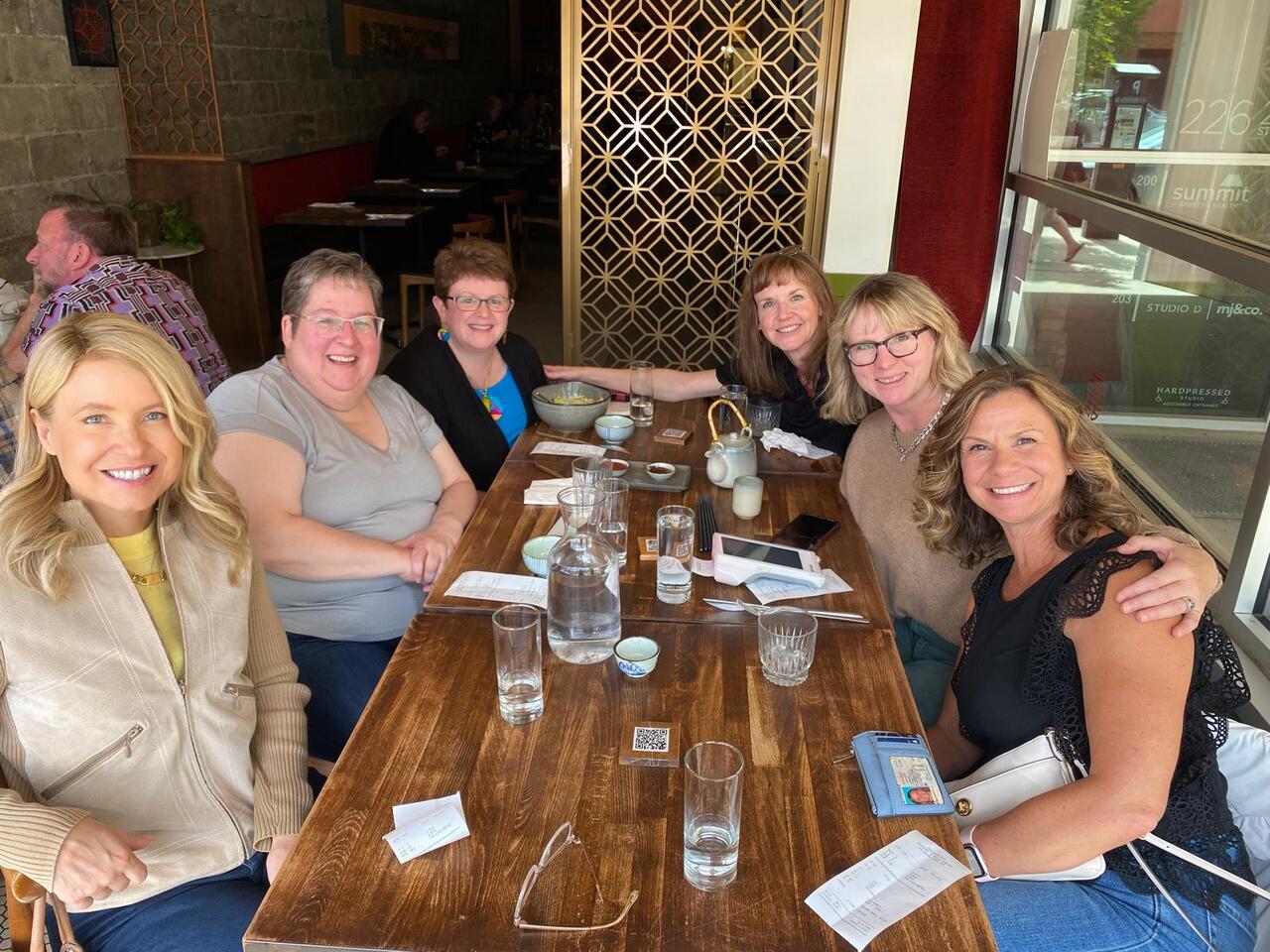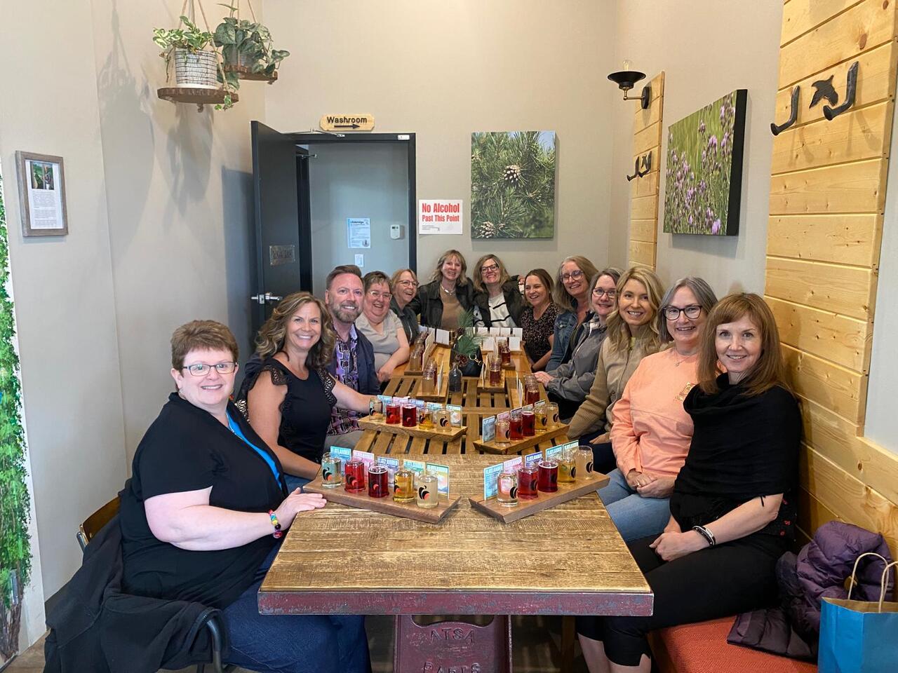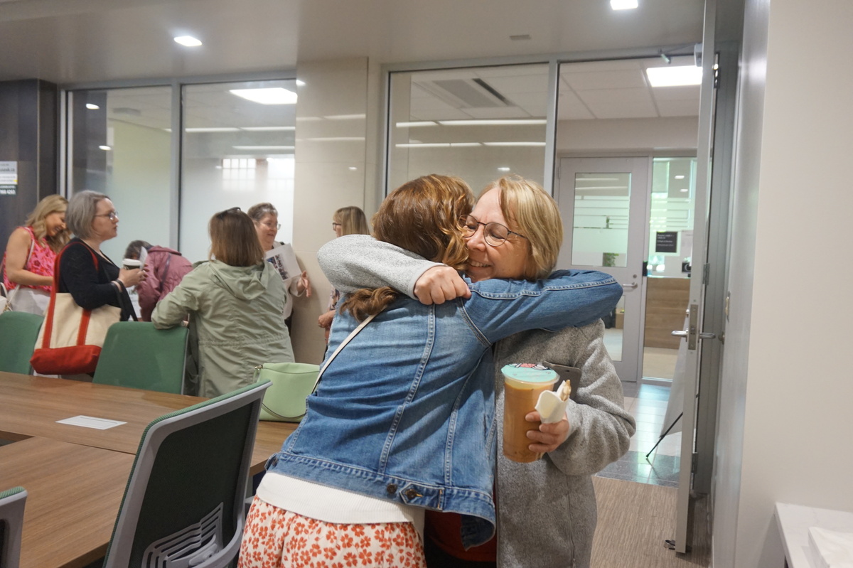 Group photo of the women who attended the 1994 degree class reunion. 3 women sitting on chairs and 8 are standing behind them in front of a wall of plants in the Health Sciences building.